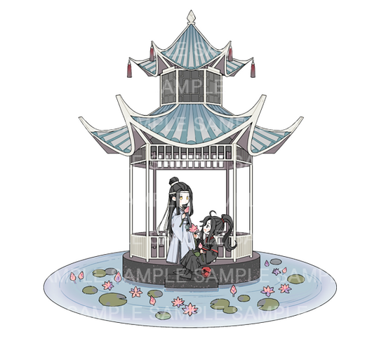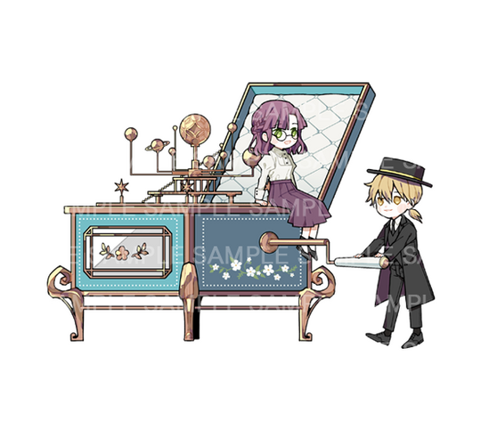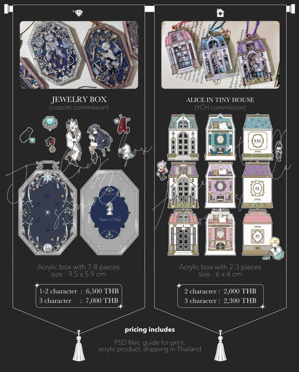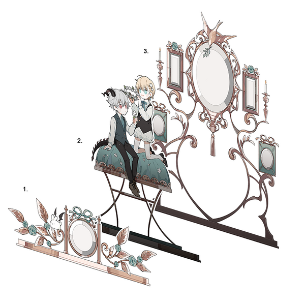 You can have 1 to 3 characters, but the size of the characters will affect the number of accessories inside the box. If the characters are larger, like having long hair or wearing a big skirt, you'll need to reduce the number of accessories by at least 1, since space is limited.For the acrylic work, the characters can be designed as separate pieces or as one single piece, depending on the pose or composition (as long as the characters don't physically touch each other, like holding hands)