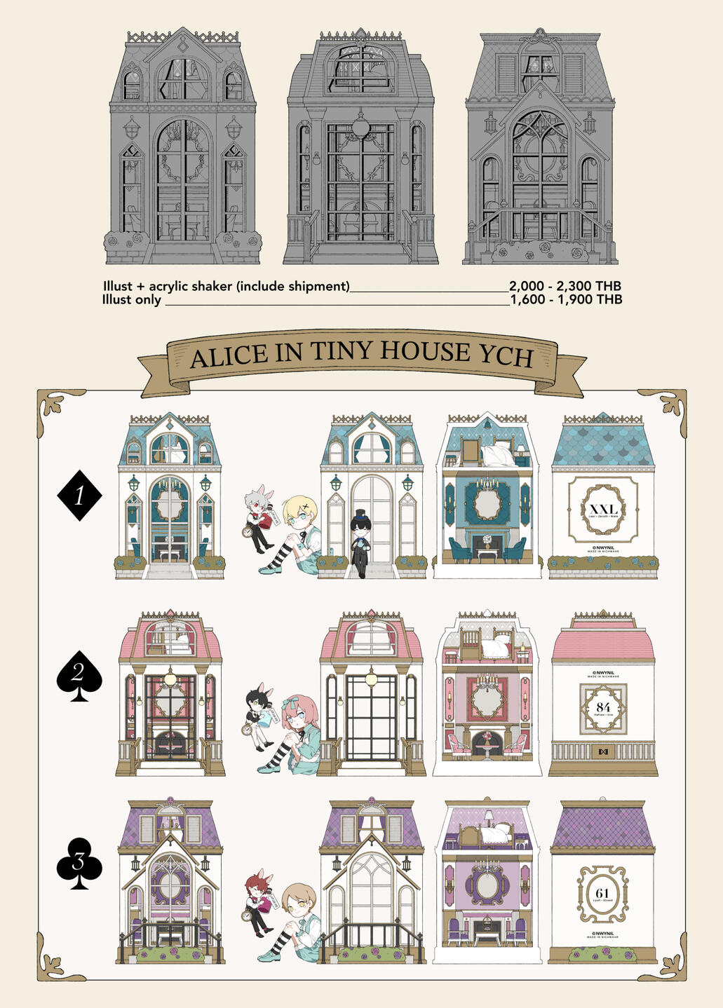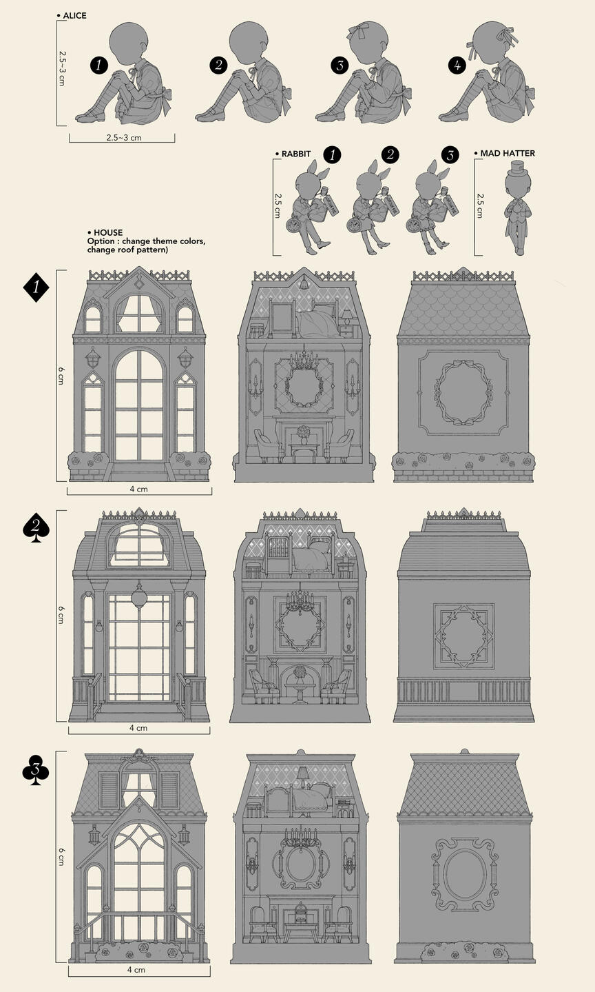 Let us know the house design number you’ve chosen and the number of characters you’d like. There must be at least one Alice character, along with either the White Rabbit or the Mad Hatter (1+1) — or you can include both if you prefer (1+2).